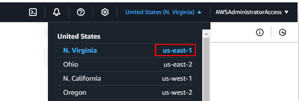 2. The top right corner displays the current region name (ex. N. Virginia, Ohio, ...)