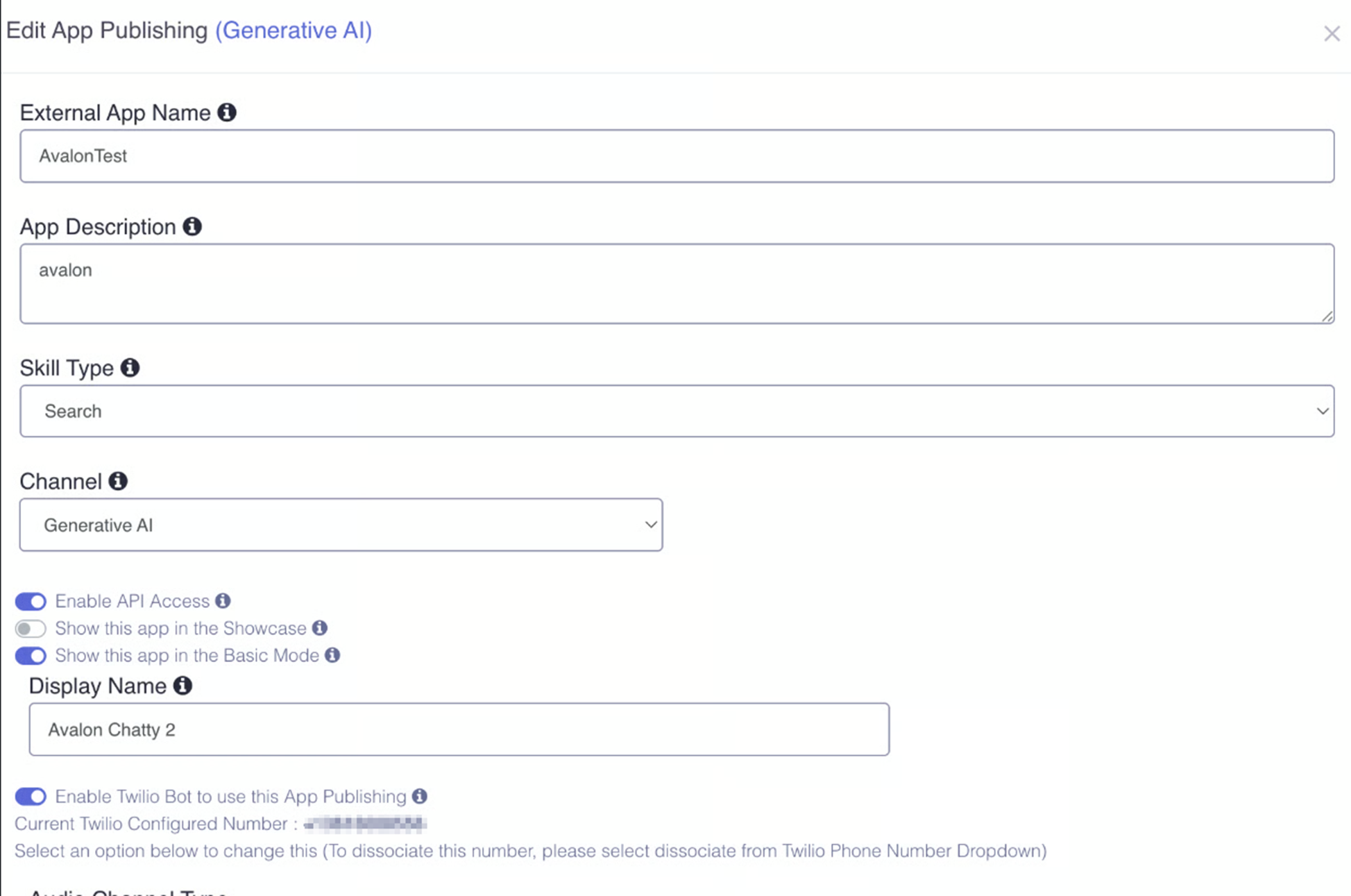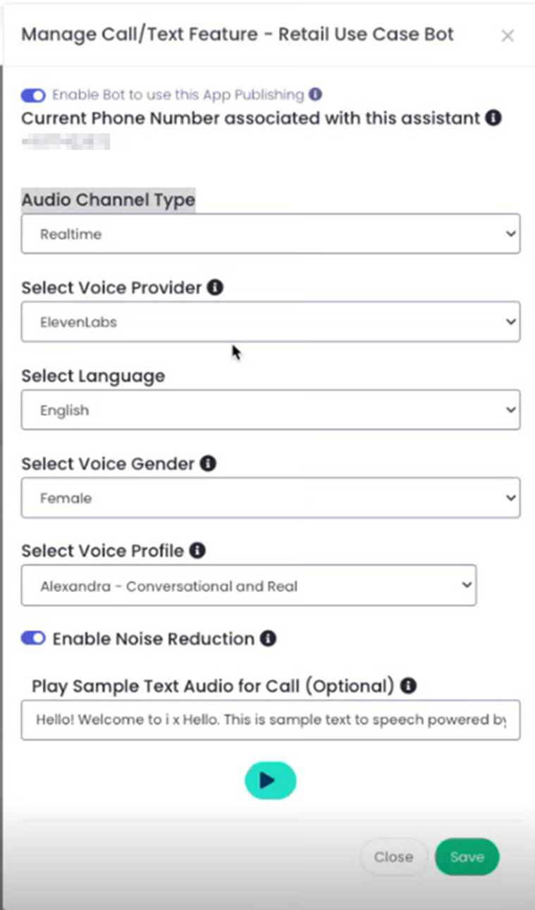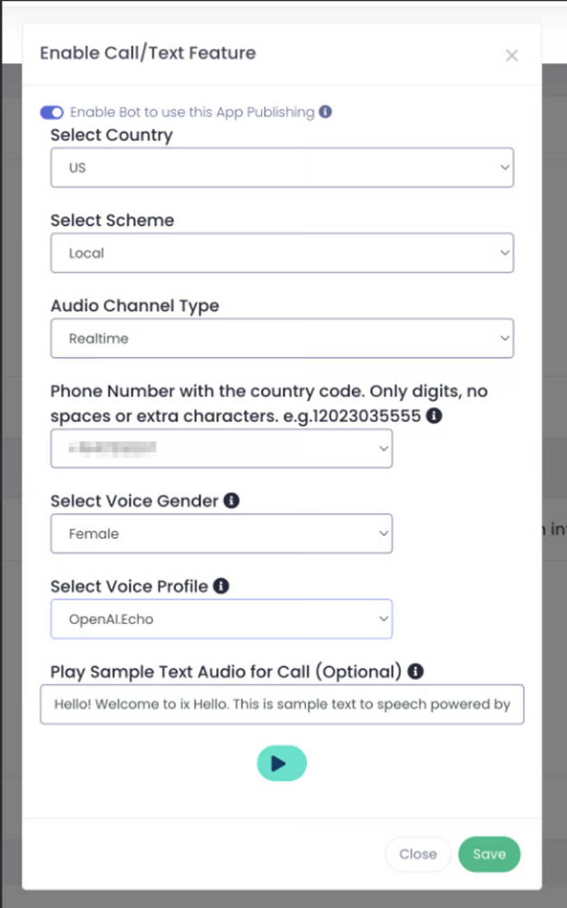 The backend configuration for RTC, can be achieved in Basic Mode. We can configure managing Call/Text Feature in the ixHello platform by enabling the API access of the bot and by choosing the Audio channel to be Real Time.